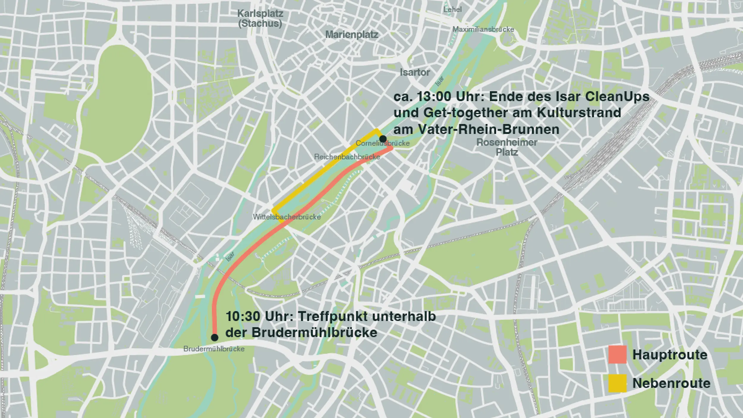 - ab 11 Uhr: Polarstern Isar CleanUp bis zum Vater-Rhein-Brunnen an der Ludwigsbrücke.