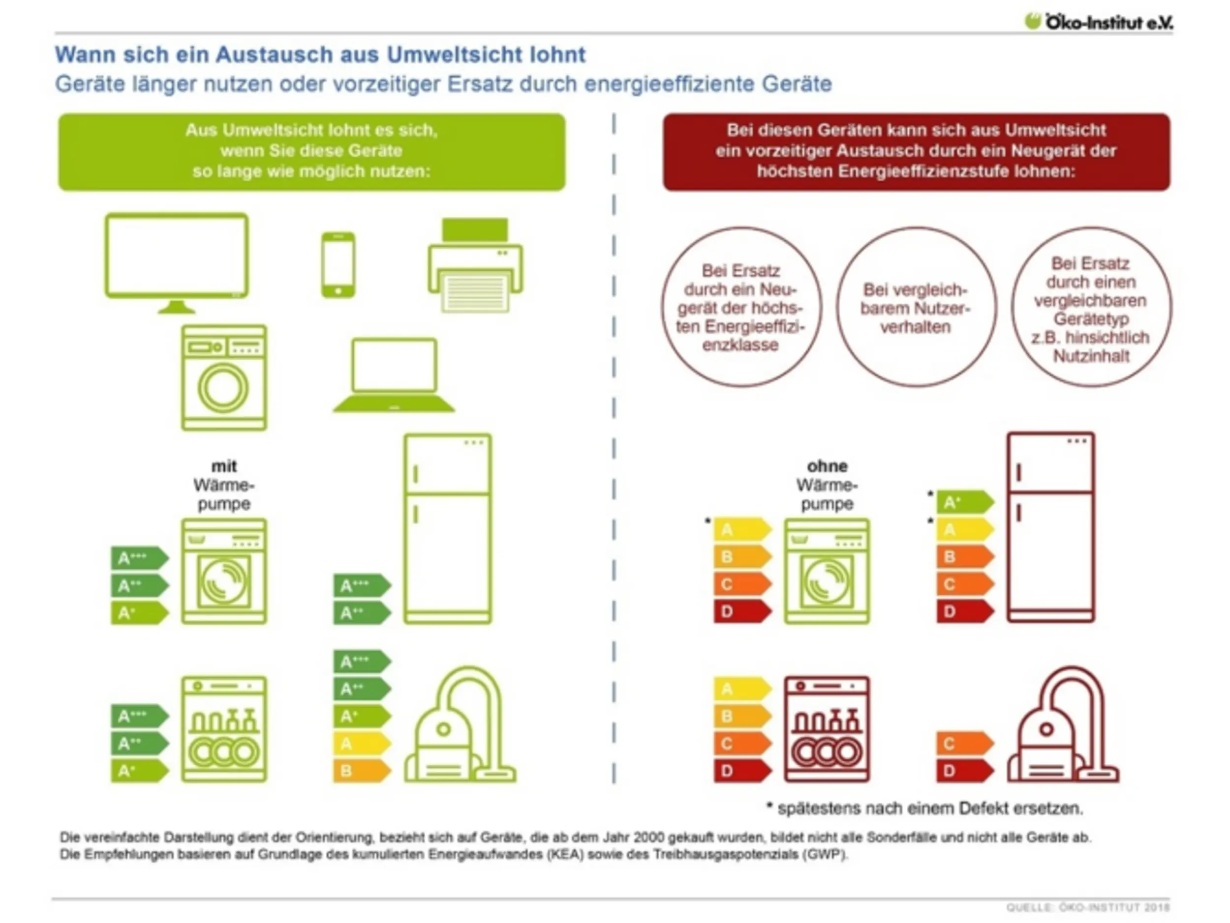 Bei der Frage, ob man sich ein neues Gerät zulegen sollte oder nicht, tendiert die Umwelt meistens zu einem Nein. Denn ein Großteil des Energieverbrauchs und der Emissionen fallen bei der Herstellung an. Ein Smartphone verursacht beispielsweise während der Produktion 5- bis 10-mal mehr CO2 als in der Nutzung. Achte beim Neukauf von Geräten auf Nachhaltigkeitssiegel wie den Blauen Engel oder das EU-Ecolabel. Die Siegel stehen für eine ressourceneffizientere Produktion. Das Öko-Institut gibt eine Empfehlung, bei welchen Geräten der vorzeitige Austausch auch umwelttechnisch eher okay ist.