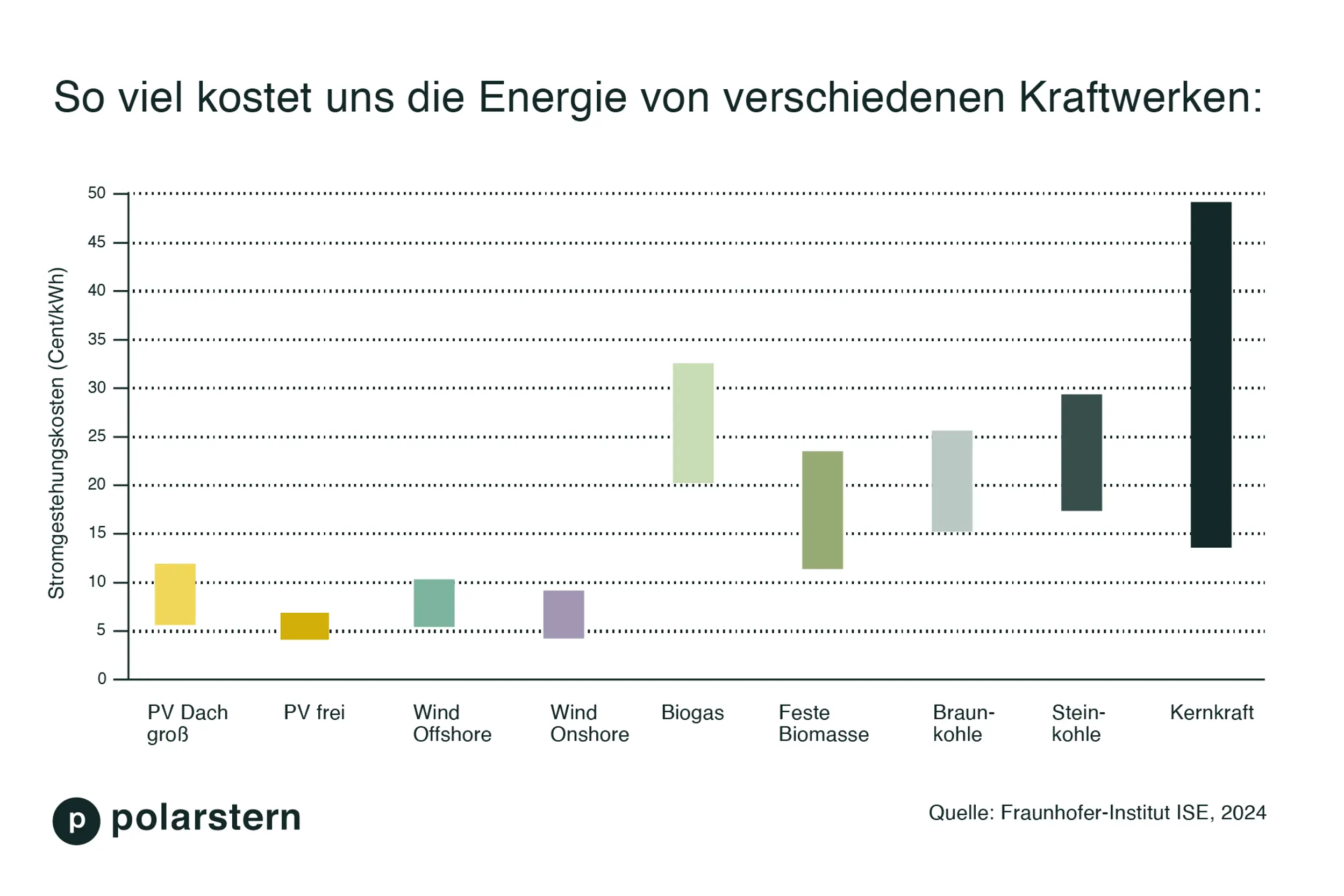 *Quelle: Fraunhofer ISE, Stand: Juli 2024. Bei den Stromgestehungskosten gibt es eine Bandbreite aufgrund verschiedener Parameter bei der Berechnung (bspw. Anlagenpreise, Sonneneinstrahlung, Windangebot, Zahl der Volllaststunden etc.)