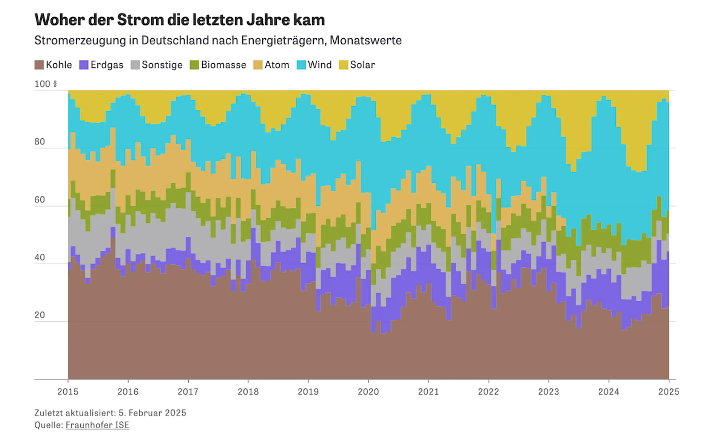 Fazit: Fossile Energien sind teurer und haben einen immer kleineren Anteil am deutschen Strommix. 2024 lag das Niveau der Kohleverstromung auf dem des Jahres 1957. Wow. Betrachtet man die enormen Kosten für den Bau, die Stromerzeugung und die Bauzeiten von Atomkraftwerken, ist klar, dass uns diese Energieform kurzfristig nicht helfen kann. Bei der oft gescholtenen Windenergie hingegen, die schon jetzt ein Leistungsträger ist, ist sogar noch das ambitionierte Ausbauziel von 2030 erreichbar, wie eine neue Prognose des Thinktank Goal100 zeigt. Solarenergie boomt ohnehin und ist die günstigste Form der Stromerzeugung und kann darüber hinaus auch von Privatpersonen genutzt werden, weil Photovoltaik jede:r installieren kann. Der Anteil der Solarenergie wurde zuletzt immer größer, wie folgende Grafik zeigt.