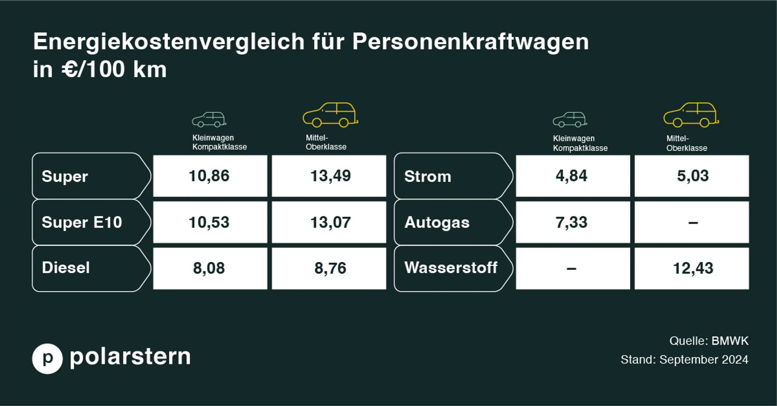 Auch beim Blick auf die Betriebskosten macht der Umstieg auf und der Kauf eines E-Autos Sinn. Das Tanken von Verbrennern wird schließlich von Jahr zu Jahr teurer; zuletzt sind die Spritkosten Anfang 2025 in die Höhe geschossen. Grund ist auch die CO2-Steuer auf Benzin und Diesel, die ab 2025 auf 55 Euro pro Tonne CO2 steigt. Auch in den nächsten Jahren verteuert sie das Fahren mit einem Diesel oder Benziner immer weiter. Das Laden von Elektroautos ist schon heute viel günstiger als das Tanken von Diesel oder Benzin (siehe Grafik) – und wird es in Zukunft noch viel mehr.