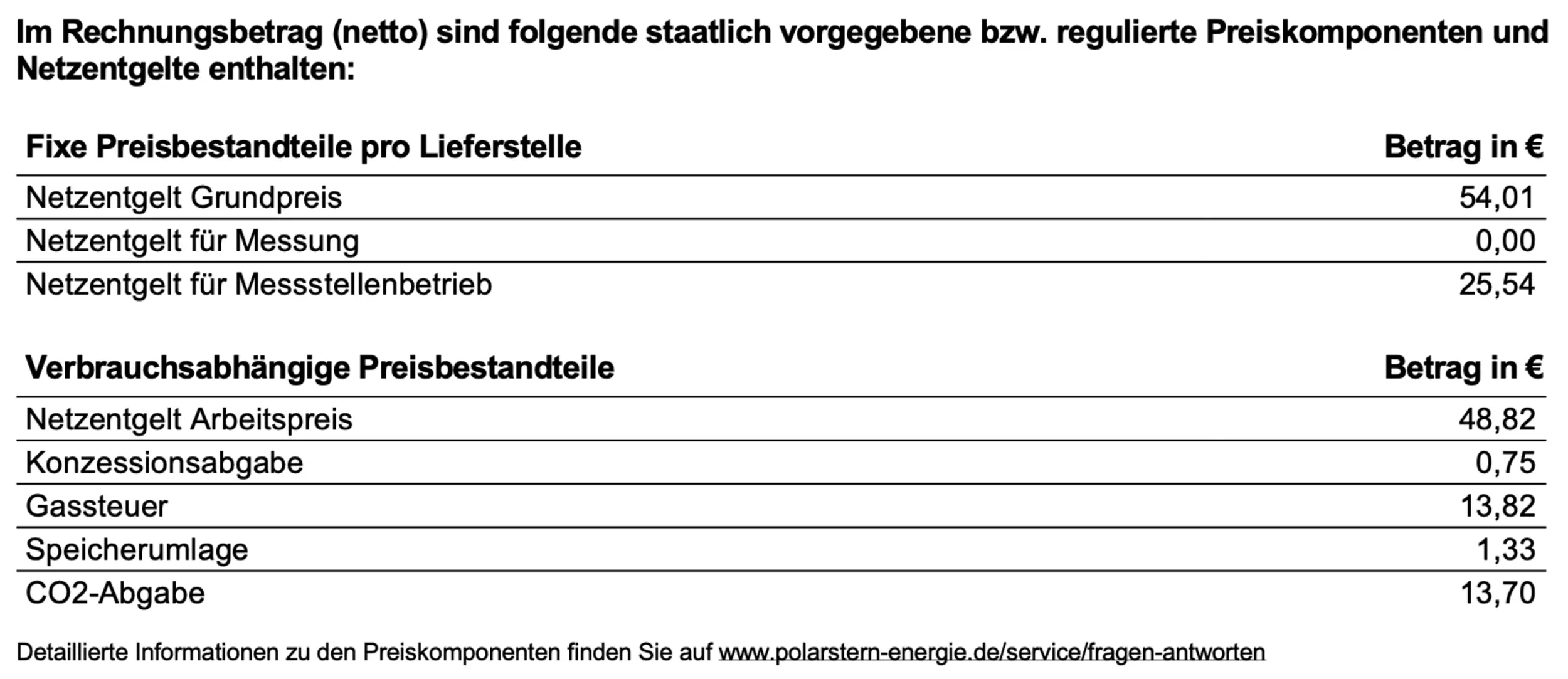 Im Abschnitt Preisbestandteile erfährst du, was in deinem Gaspreis sonst noch so drinsteckt. Etwa die Kosten für deine Netzentgelte und die Konzessionsabgabe. Diese Komponenten sind staatlich vorgegeben, beziehungsweise reguliert. Das Netzentgelt ist der Teil der Energiekosten, den du als Kund:in für die Benutzung des Gasnetzes zahlst. Die Netzentgelte fallen für jede Postleitzahl anders aus. Die Konzessionsabgabe ist die Gebühr, die Gemeinden von den Netzbetreibern für die Verlegung von Gasleitungen erheben.