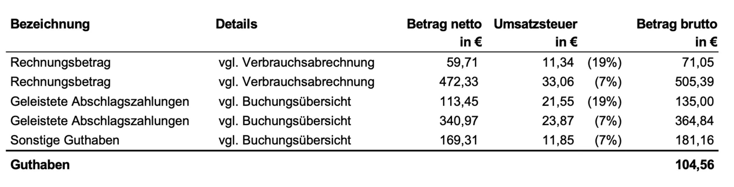 Als Erstes erfährst du die Höhe des Rechnungsbetrags. Das ist der Gesamtbetrag deines Gasverbrauchs im Abrechnungszeitraum. Unter diesen Gesamtkosten steht der Betrag, den du bereits über deine monatlichen Abschläge bezahlt hast. Hast du über die Abschläge im Abrechnungszeitraum mehr bezahlt als für den Rechnungsbetrag nötig, bekommst du eine Guthaben ausgezahlt, sprich Geld zurück. Haben die Abschläge den Rechnungsbetrag nicht gedeckt, musst du einen Betrag nachzahlen und noch etwas überweisen. Das Gasrechnungsbeispiel zeigt ein Guthaben: