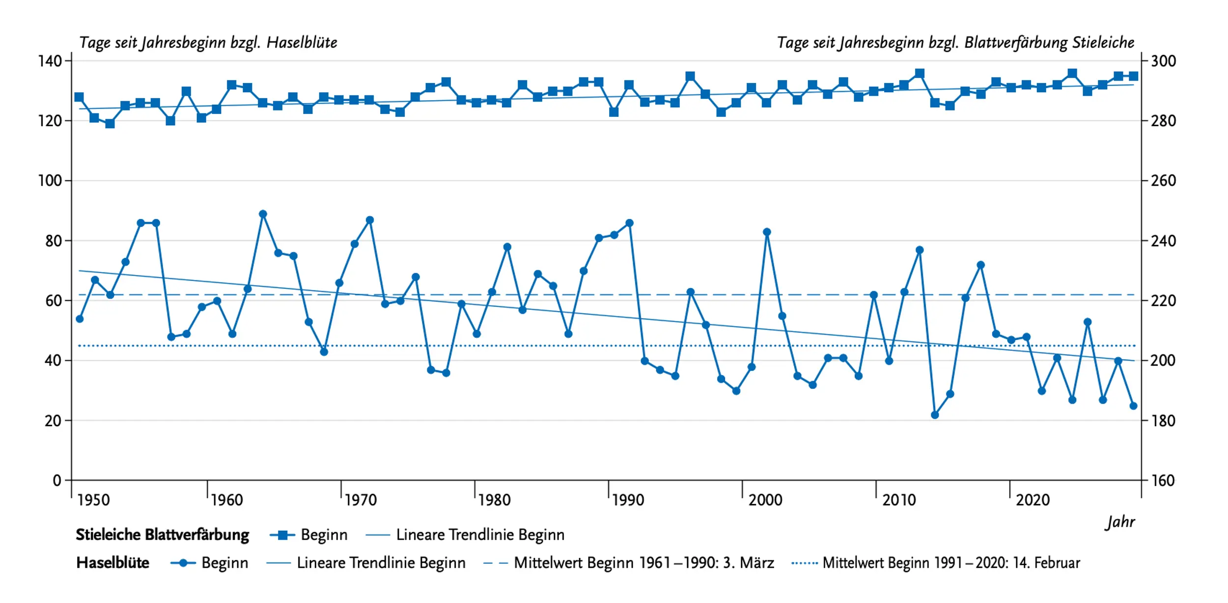 Die Entwicklung der Pollensaison zeigt auch die folgende Grafik des RKI. Der Trend für die Blüte der Haselpollen (untere Linie mit Punkten) geht seit etwa drei Jahrzehnten in Richtung im Januar. Zuletzt dauerte es teils nur rund 20 bis 25 Tage nach Jahresbeginn, bis die ersten Haselpollen flogen. Zum Vergleich: In den 50er- und 60er-Jahren begann die Haselblüte meist zwischen 60 bis 80 Tage nach Jahresstart.