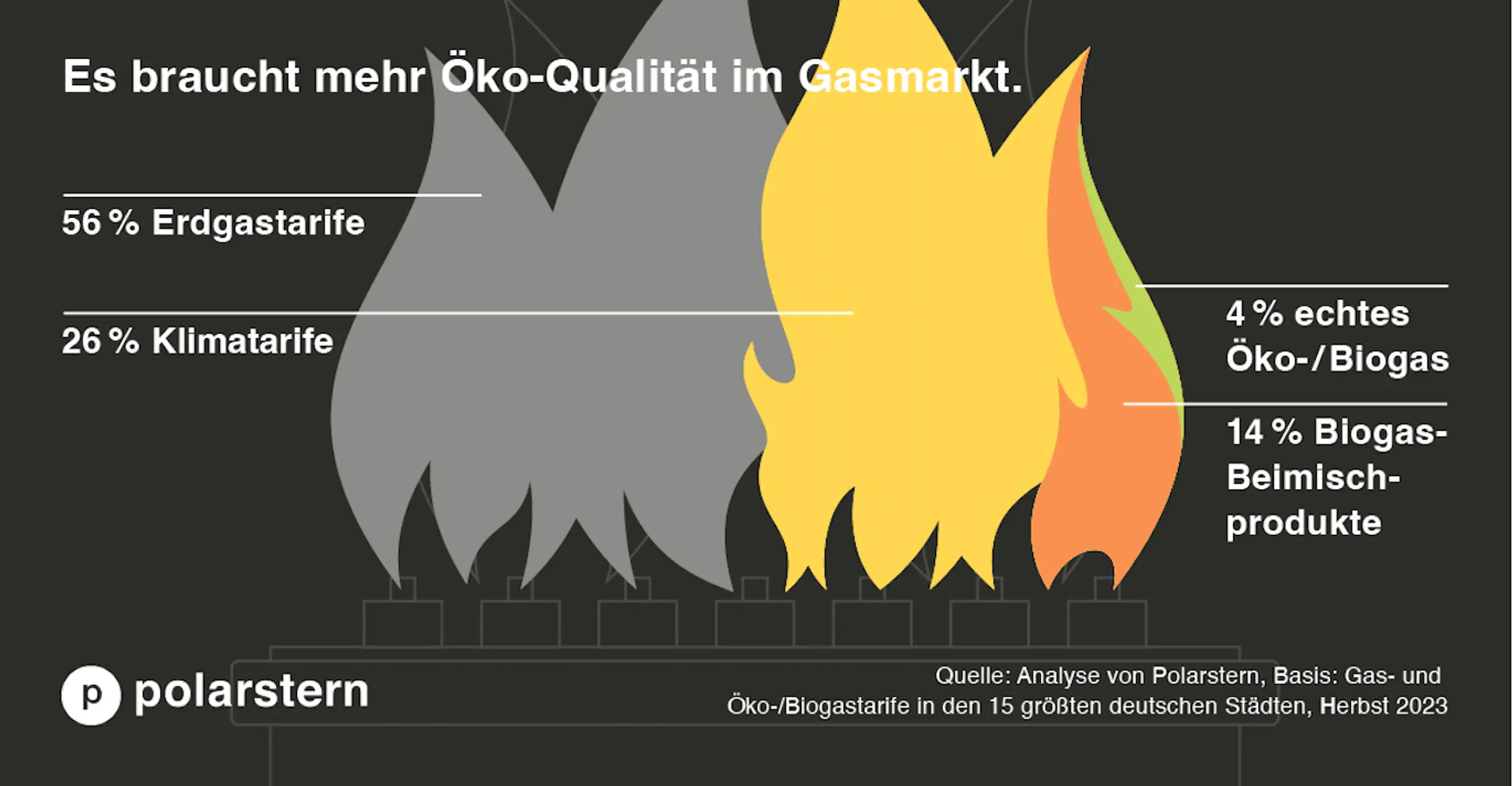 Es ist ein bisschen so, als ob du ein vegetarisches Gericht bestellst und stattdessen etwas mit Fleisch bekommst, weil sich das Restaurant für den Tierschutz engagiert. Macht keinen Sinn, oder? Ein bisschen so läuft es aber bei den Klimatarifen ab: Du kriegst nicht, was du bestellst. Und leider sind diese Klimatarife absoluter Usus. Im Jahr 2023 waren 26 % der angebotenen Ökogastarife solche Kompensationsprodukte.
