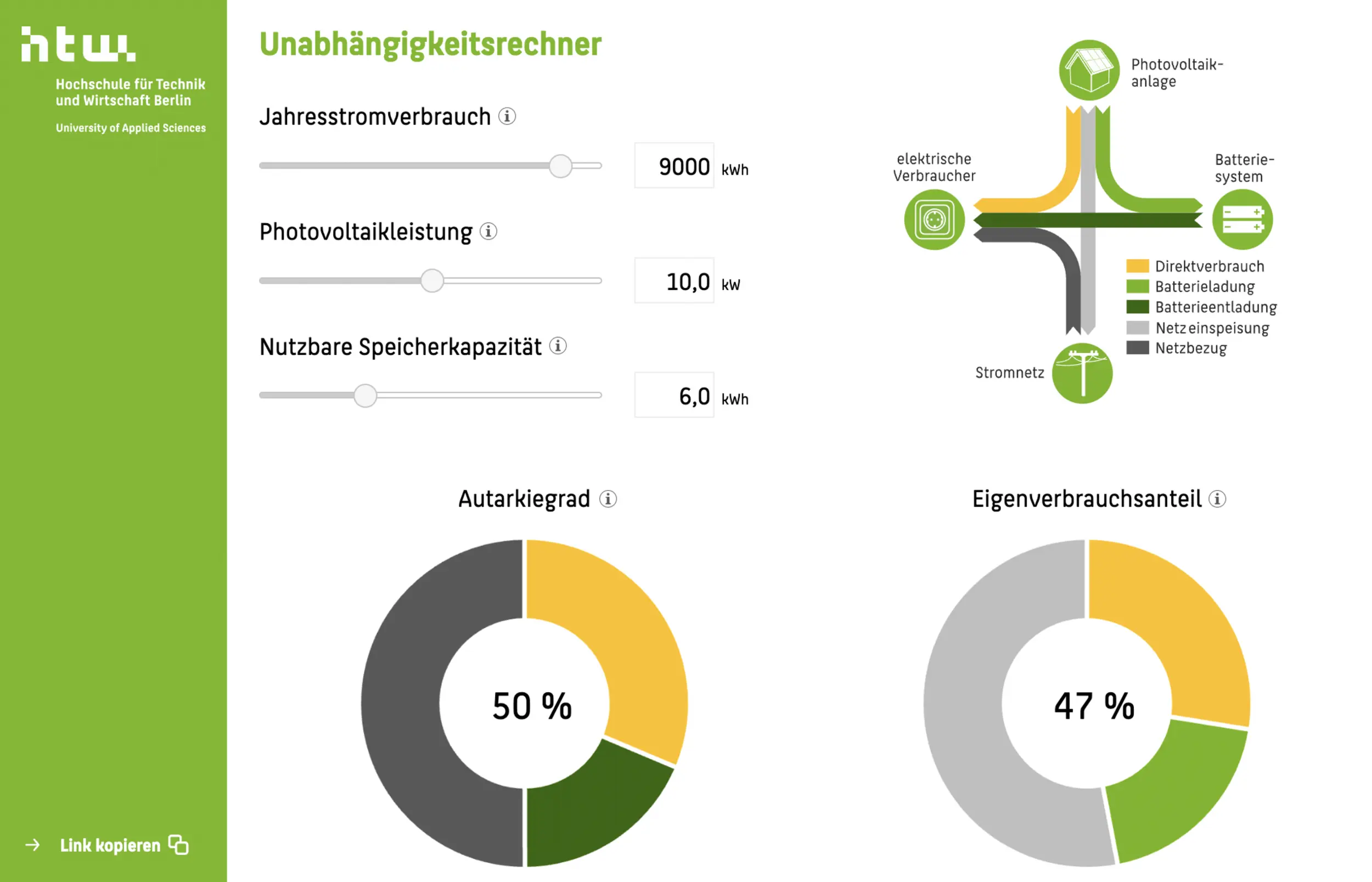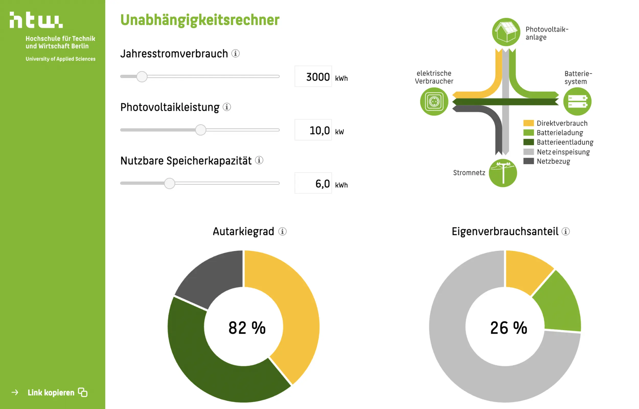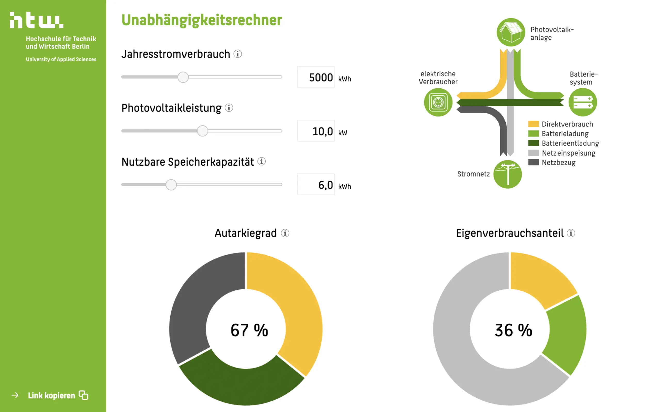 Rechne am besten auf der Seite der Hochschule für Technik und Wirtschaft Berlin aus, welche Leistung deine Solaranlage und dein Stromspeicher haben müssen, um eine hohe Autarkie zu erreichen.
