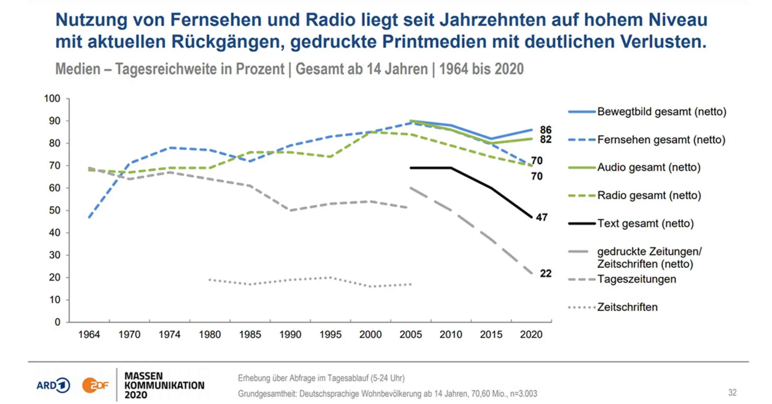 “Aktuell nutzen 94 Prozent der deutschsprachigen Bevölkerung ab 14 Jahren das Internet zumindest gelegentlich. Dies entspricht 66,4 Millionen der insgesamt 70,6 Millionen Personen ab 14 Jahren in Deutschland, was einen Zuwachs von 3,5 Millionen bedeutet. Vor allem die älteren Zielgruppen ab 60 Jahren tragen dazu bei.” – ARD/ZDF-Onlinestudie 2020