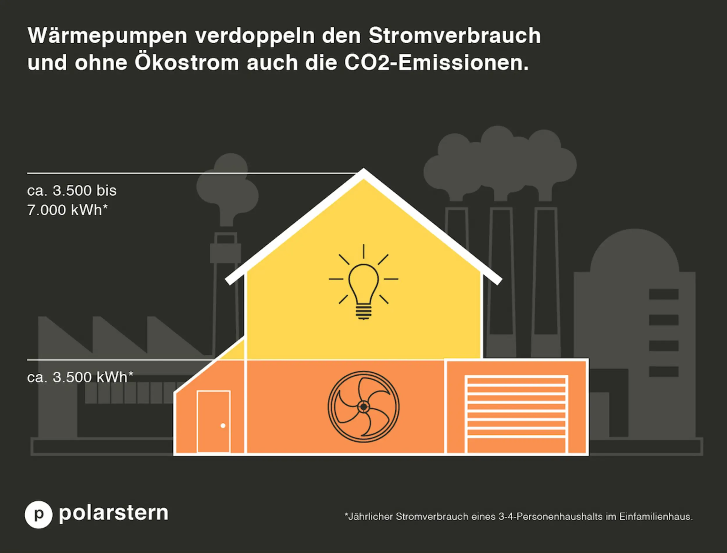 Wärmepumpen brauchen besonders bei niedrigen Außentemperaturen viel Strom: Der Stromverbrauch eines Drei- bis Vier-Personen-Haushalts kann sich durchaus verdoppeln – und damit auch die CO2-Emissionen, wenn man die Pumpe mit konventionellem Kohlestrom betreibt. Wärmepumpenstrom von Polarstern ist hingegen CO2-frei. Bei einem Stromverbrauch von rund 3.500 kWh sparst du jährlich mehr als 1,5 Tonnen CO2. Und das zu einem fairen Preis. Wir bieten dir Spezialtarife für Wärmepumpen mit und ohne extra Stromzähler.