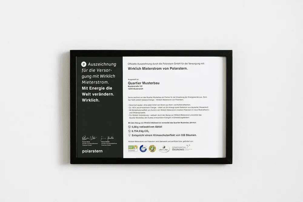 Wir bieten unseren Mieterstrom-Partnern verschiedene Materialien, um auf die Mieterstromversorgung aufmerksam zu machen. Haushalte, Gäste und Geschäftspartner erfahren so, dass direkt vor Ort Energie klima- und energiebewusst erzeugt und genutzt wird. Und Immobilienbesitzer:innen zeigen, dass sie gemeinsam mit Polarstern an einer fairen, nachhaltigen Energieversorgung arbeiten.
